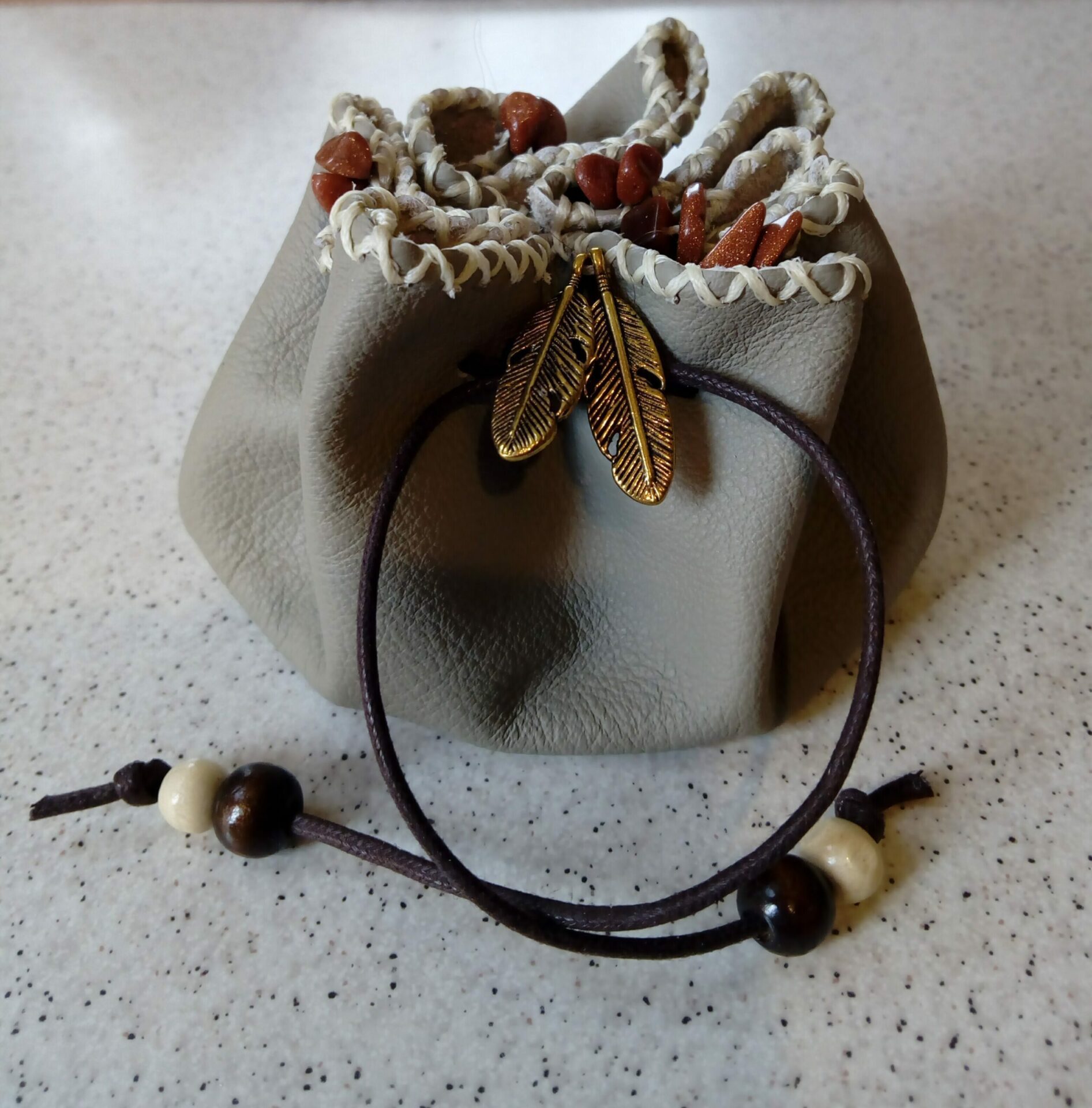portarune con pietra del sole e piume dorate